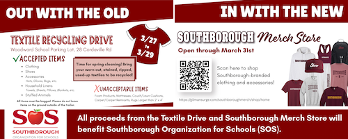 Southborough Organization for Schools (SOS) asked me to share news about two fundraisers. One of them is taking place over the weekend. The other is running now through Monday. Read the full article → from SOS Textile Drive & Merch Store